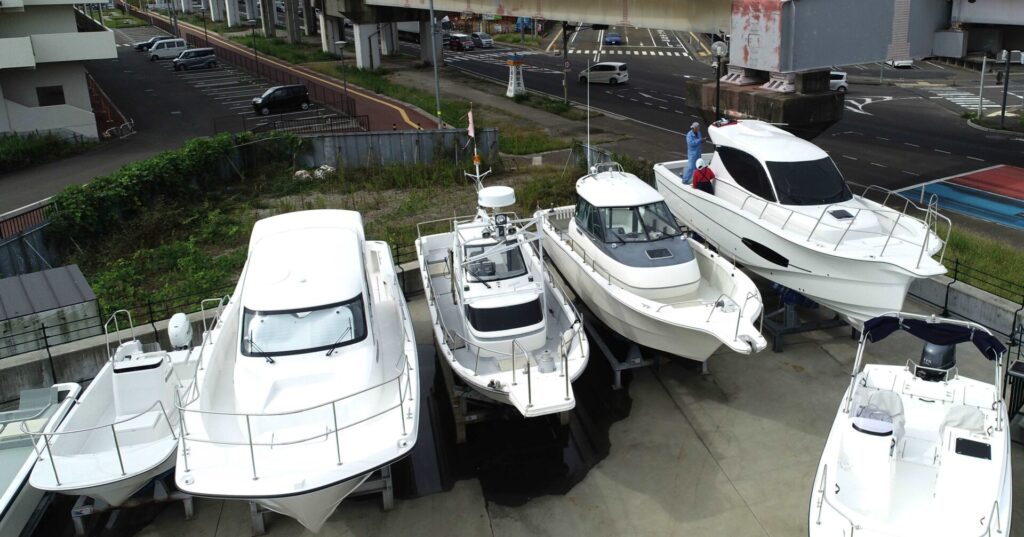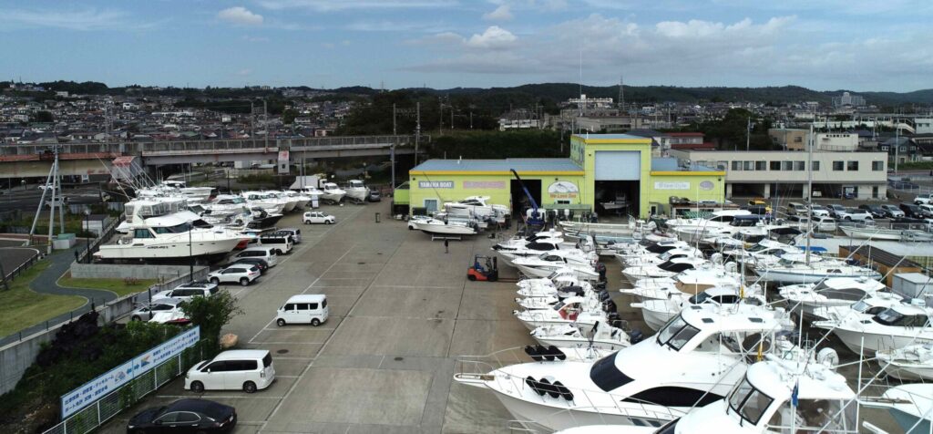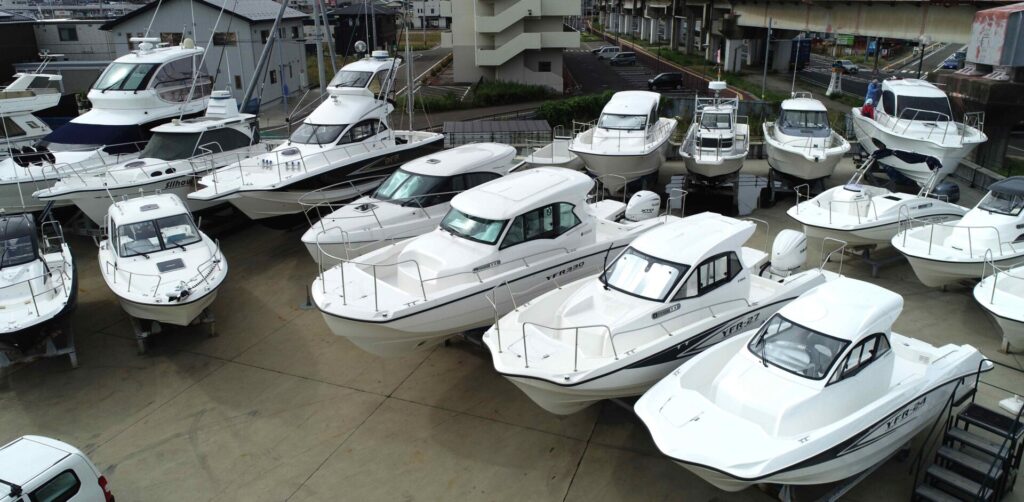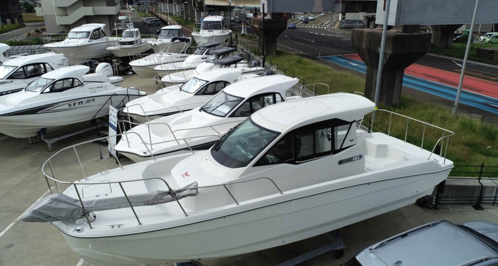 展示場、9月新規入荷はヤマハYFR24 ヤンマーEX34 は艤装段取りに入りました、工場前にはやはり9月入荷のヤマハエスクワロもありです