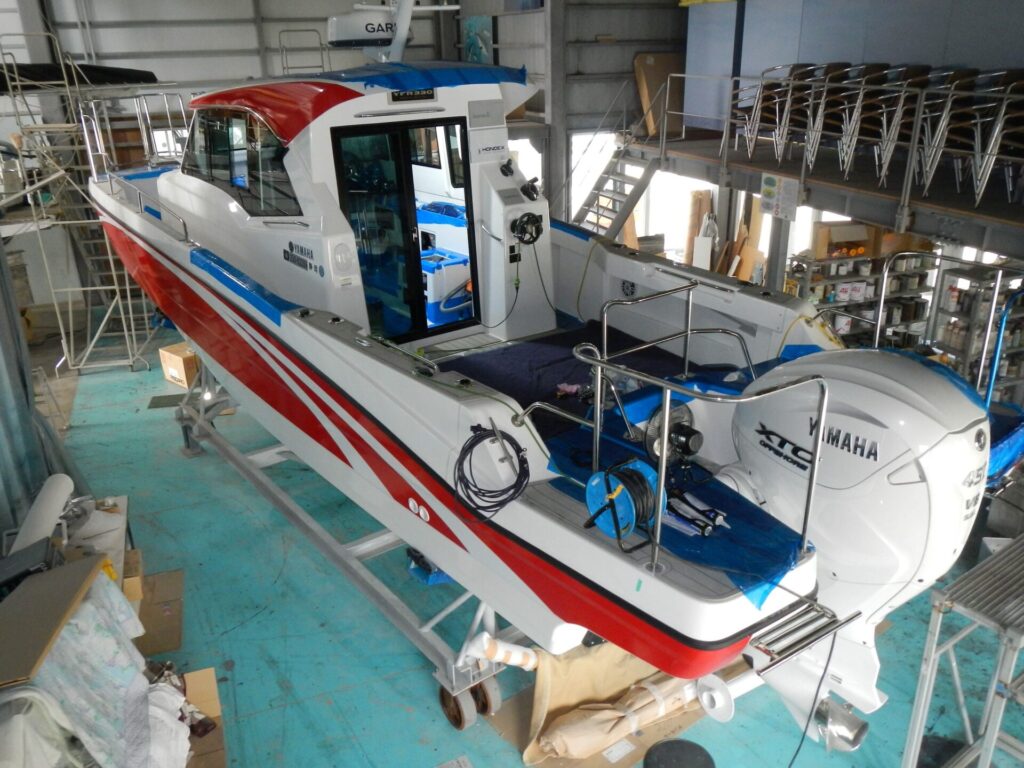 ヤマハYFR330 2隻目納入艤装工事中です、ラッピング施工、デッキやブルワークはチークです