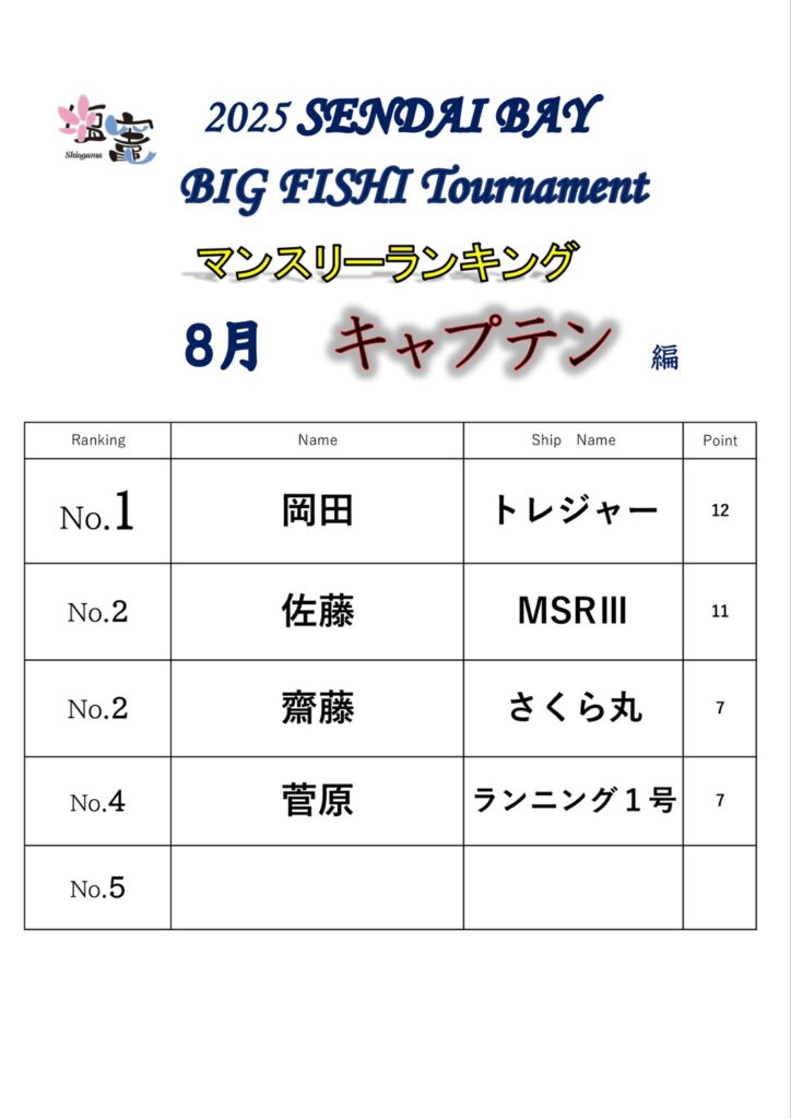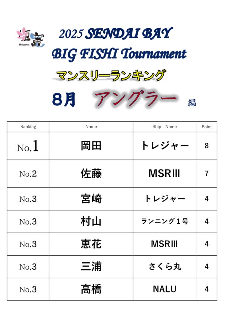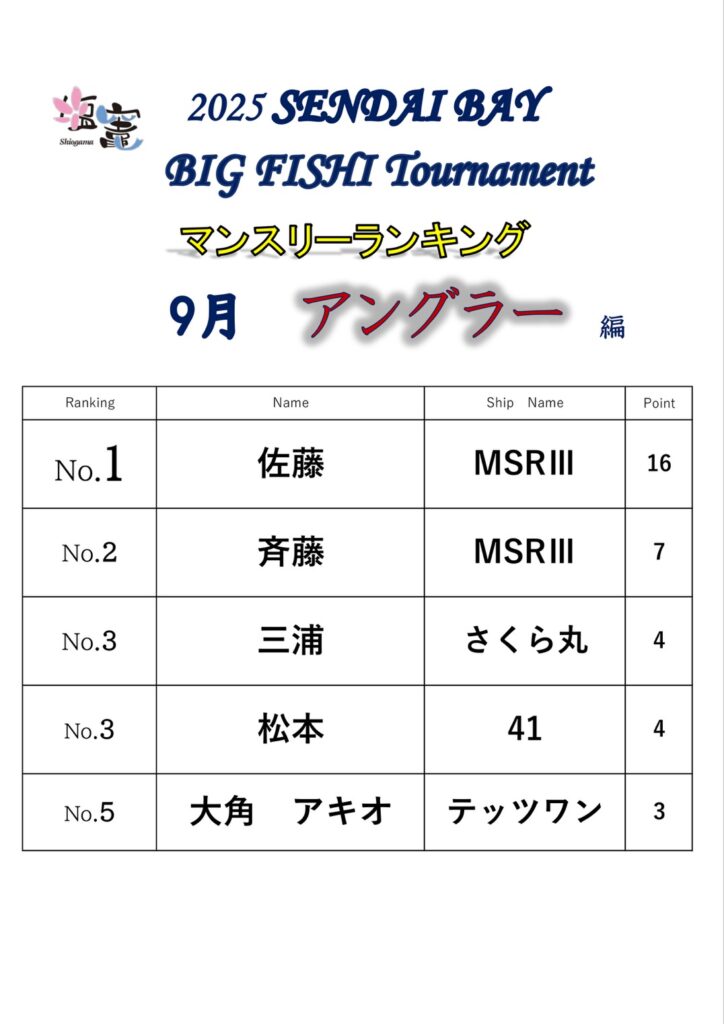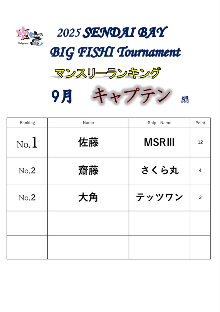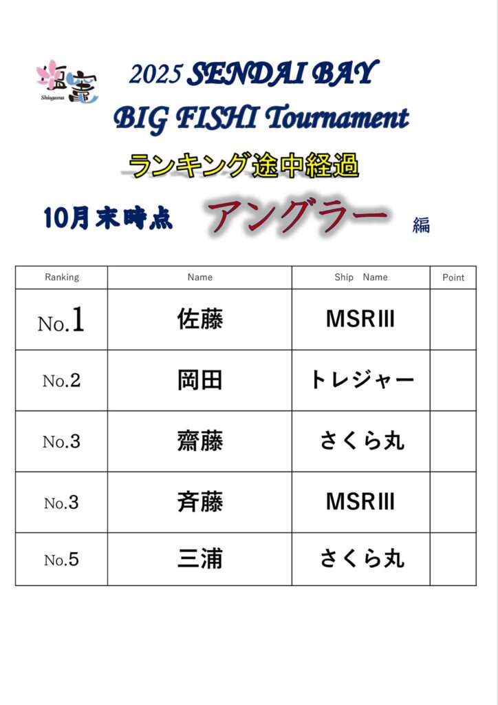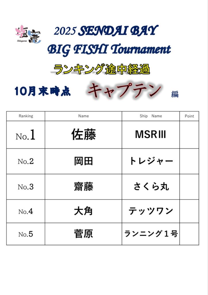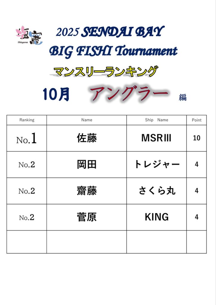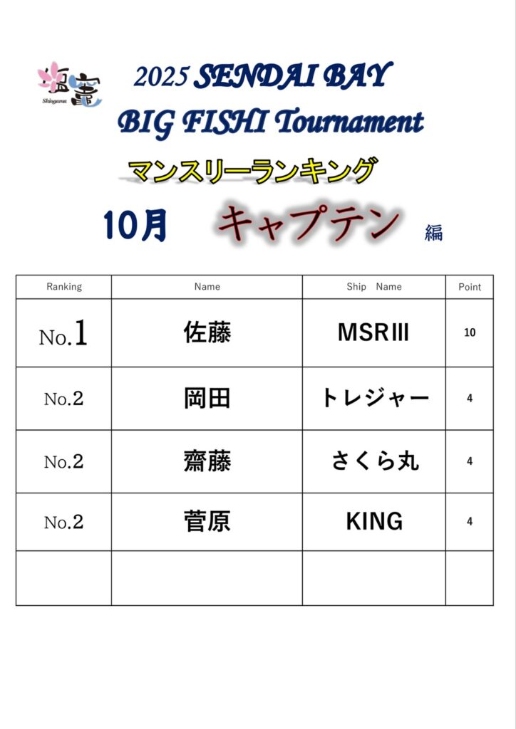 現在開催中のビックワンTについて、各月のランキング及び10月末時点での年間ランキング発表です!!